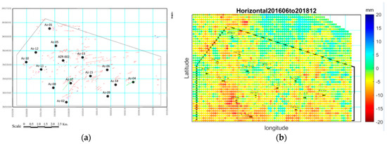 (a) Distribution of wells and cracks in Azar oil field. (b) Horizontal displacement in the Azar oil field area between June 2016 and December 2018.