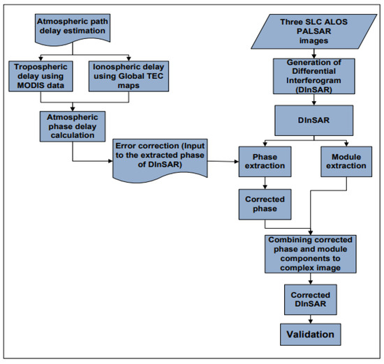 Synthetic aperture radar (SAR) as an extensive tool uses SAR interferometry (InSAR) which is a processing technique to measure the topography of the surface, its changes over time, and also other changes in the surface. It is a technique in which two SAR images are combined to produce an interferogram. An interferogram is a phase interference image. In SAR interferometry, the deformation signal obtained from the Earth surface is mixed with topographic signal. To overcome this problem, a differential interferogram is used. A three-pass differential synthetic aperture radar interferometry or DInSAR is used in remote sensing for measuring Earth surface deformation [1,2]. When two interferograms are formed from three single look complex (SLC) images, the interferogram phases are again differenced to form one more interferogram which is termed as “Double-Differenced Interferogram” [3]. This step removes phase changes due to topography and a new phase image is formed. The final phase of the DInSAR consists of surface change phase contributions, atmospheric delay contribution, and phase noise [4]. The atmospheric effects which contribute to phase differences cannot be easily distinguished from surface displacements. The effect of atmospheric contributions has an impact on altitude and surface deformation measurements [5,6]. The approach adopted in this work is shown in the flow diagram of methodology as shown in Figure 1.