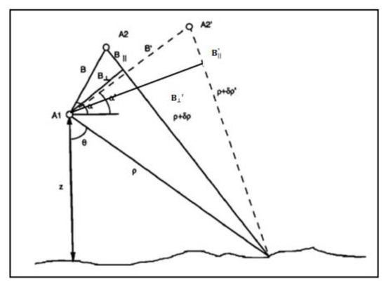 The flattened interferogram is equal to the product of the perpendicular component of the baseline and topographic angular distortion δθ. From Figure 3, the ratio of the two phases could be written as [9]: