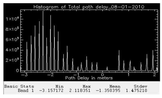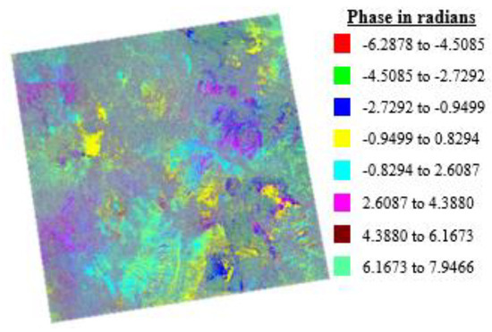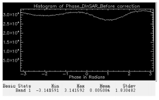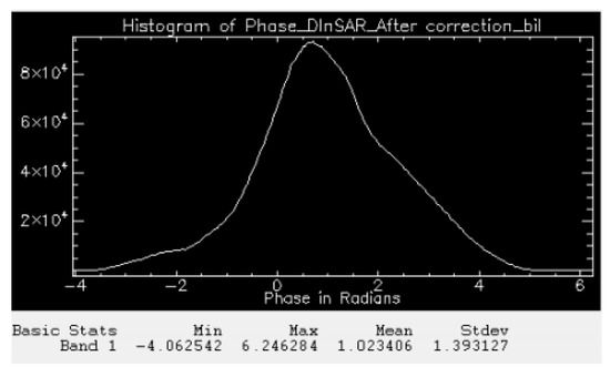 The phase of DInSAR before correction as seen in Figure 7 shows a variation between −3 and +3 rad. After applying the correction, as seen in Figure 8, the phase values appear close to zero. The DInSAR which is an outcome of subtraction of two interferograms contains the displacement phase. According to a minor survey made on the study site, no changes in the land have been recorded and hence there is no displacement phase present in the DInSAR. Most of the phase as seen in the above figure has accumulated around zero. However, the phase is not exactly equal to zero. This is because of the baseline decorrelation and presence of phase noise (error due to temporal decorrelation and volume scattering). The atmospheric correction has influenced the values of the DInSAR to a great extent. When the phase of the DInSAR before correction and phase of the DInSAR after correction are observed, a drastic change is noticeable. Before the correction, the phase as seen from Figure 7 shows random variation. Once the correction is applied, the phase values are altered and are brought back to a meaningful phase term.