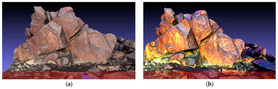 - 3D Mesh with the possibility of digital enhancement with the de-correlation view based on DStretch (Figure 1b). This is clearly an improvement in the view over some representations.