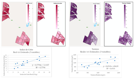 Comparison between real maps and maps modeled from a multiple linear regression function. The example shows only two results: Color Index and Tannins.