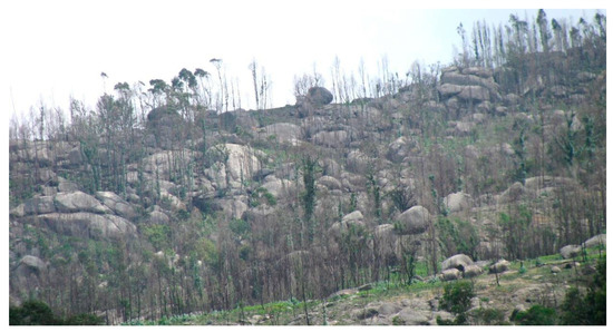 The term outcrop will be used in what I believe to be its classic meaning, namely portions of geological objects in expositions that are not the result of human action. Outcrops are the classic founding objects of geology and the large majority of geological studies are based on them (even if this seems to be changing). The perspective here is to look for and collect the largest amount of stamps, and there are recommendations for field recognition that amount to a kind of stamp-collecting rules (see, e.g., the classic work of Compton [5]). However, paraphrasing the words of Laznicka [6] in relation to mineral exploration, “everything goes” as long as it leads to new discoveries (which will be suited to the stamp collecting perspective). An example is presented in Figure (stamp) 1, showing the typical boulder weathering of granitic massifs. This view can also be used to discuss hazards related to the movement of rock boulders, and similar stamps were used by Sanjurjo-Sánchez and Alves [7] to discuss the potential advantage of such processes to obtain stones suitable for the building of structures with minimal processing.