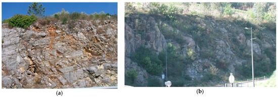 Stamps showing anthropogenic rock-cuts: (a) road slope on a limestone mass showing the bedding, joints and the effects of weathering (terra rosa); (b) road slope on a granite mass showing jointing that can promote rock movements, supporting net (to minimize this hazard) and natural recovery of vegetation.