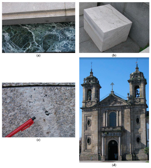 Stamps showing built structures: (a) Juxtaposition of granite stones (similar to the local stone) and exotic green breccia; (b) marble block with planar structures that illustrate an apparent variation of dip with view plane; (c) pegmatite veinlet on a granite stone; (d) image of the main façade of the Populo's church in Braga (Portugal).