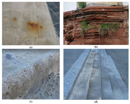 This section comprises cases that are related to anthropogenic action and that might be not considered “geological” from a more traditional point of view (see discussion in [10]), but which can, nonetheless, be used to illustrate geological processes and products. All the cases considered are unintended consequences of anthropogenic action; the lack of intention being a critical issue in the delimitation, as discussed in Alves [10], based on considerations from Lyell [1], Emerson [11], Popper [12] and Dawkins [13]. Figure 4a illustrates stains related to sulfide oxidation (which can be used to discuss such issues as mineral exploration and the impact of mine wastes). Furthermore, this image also serves to discuss some limitations of this kind of stamp (and stamps in general). In some cases, the stain is contained within a single stone (and it can be discussed whether the stain was presented before the stone’s emplacement or developed afterwards), while in others the stain crosses the limits between stones (allowing to introduce a discussion of the principle of intersection). Figure 4b shows the effects of erosion along structural features (stratification), as well as illustrating the relationship between substrate characteristics and the start of biological colonization. As a closing example, I have attempted in Figure 4c,d something similar to what Taleb did with a lens cap in [14], with one stamp showing what looks like a place where travertine or tufa is forming (Figure 4c), while in Figure 4d one can see that this occurs in stair steps of the built environment. This last example illustrates a particularly important feature of anthropogenic analogues, as they can illustrate the process of formation of exotic geological substances (see [15]). The example in Figure 4c-d can also be used for 4D stamps in relation to processes (as is discussed in relation to carbonate crusts in Alves and Sanjurjo-Sánchez [16]). An example of the use of online tools for 4D stamps from the built environment has already been provided in [10], in relation to biological colonization. Finally, the example of Figure 4c-d also serves to highlight the care that must be used with anthropogenic analogues, since these crusts presents clear genetic differences in relation to classic carbonate deposits [17]. These differences can also be helpful in teaching perspectives, for example, in this specific case, to introduce the issue of carbon sequestration.