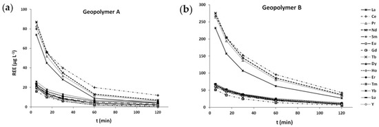The concentration of rare earth elements (REEs) in solutions (µg L−1) after a certain contact time (t) with geopolymers A (a) and B (b).