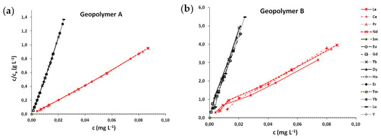 where c represents the REEs concentration in the solution in time t, ca is the amount of adsorbed REEs per unit weight of geopolymer, b is the constant of the Langmuir isotherm related to the equilibrium constant or binding energy, and cm is the maximum amount of REEs adsorbed. The adsorption isotherms shown in Figure 3 demonstrate the linearity in the investigated concentration range for all REEs.