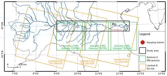 Location of the study area, shown with the extent of Sentinel-2 MSI granules and Landsat-8 OLI tiles used for the analysis. Location of the gauging station, which measured the discharge data used for the analysis, is represented by a red dot.