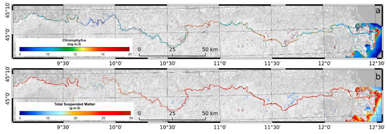 The spatial representation of Chl-a and the average TSM concentration computed from all the 326 available cloud-free Sentinel-2A and Sentinel-2B MSI granules acquired during the year 2017 (for a total of 166 observed days) is shown in Figure 2. The spatial variability shows how the concentration of suspended sediments is not homogeneous along the river channel, indicating that resuspension and sedimentation processes occur at different discharge regimes.