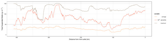 Multi-temporal statistics report Chl-a ranges between 13 and 20 mg × m−3 on average, and TSM ranges between 15 and 50 g × m−3 (Figure 3). The maximum and 90th percentile values calculated from the time series of TSM reveal a strong heterogeneity along the river channel in terms of suspended solid transport.