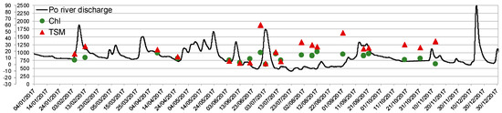 Comparison of Po River discharge and estimated Chl-a and TSM concentrations throughout the year 2017.