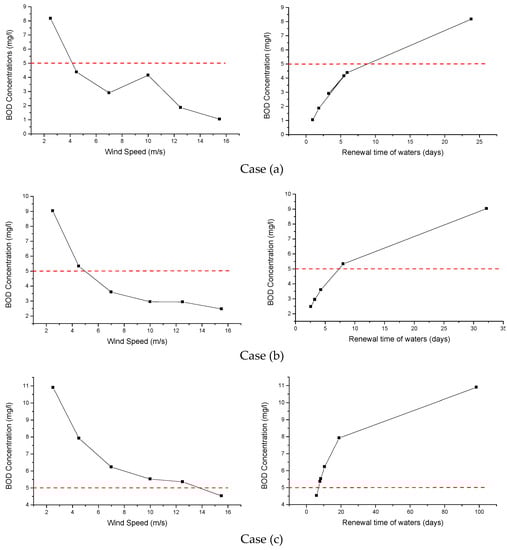- Low wind speeds, less than 2.5 m/s (2 Beaufort), lead to unacceptable values of BOD concentration (>5 mg/L) for all the cases of different formation of the opening. However, it seems that moderate winds (4–7 m/s) ensure acceptable values of BOD concentrations apart from the case of a 90 m mole centered in the opening of the harbor. The detailed statistical analysis of the meteorological data of the study area (winds’ frequency and speed), is the key process which will finally determine the right choice between different alternative cases.