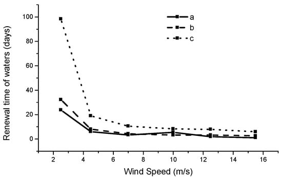- Large waters renewal times result, as expected, from low wind speeds and become even larger for the case of a 90 m mole in the opening; in fact, for this case, waters renewal times reach approx. 100 days for low wind speeds, becoming multiple of the ones corresponding to the case of free opening or the case of a 50 m mole centered in the opening. This result obviously leads to unpleasant and hazardous environmental situations.