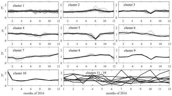 Figure 2 shows the clusters of the optimal cluster solution, along with cluster centroids. Clusters 1–5 have more than 5 pattern each, and they can be considered meaningful because they have correctly detected different customers behaviors especially related to summer consumption. Specifically, cluster 2 shows a consumption increase in August, presumably related to customers that spent summer 2016 in town; clusters 1, 4, 3 and 5 show a progressive decrease consumption in August (this could be related to an increasing number of summer holidays with zero or low consumption). In all the other months of the year, however, clusters 1–5 show a similar behavior, with a water consumption that is quite constant. Clusters 6–10 can be considered meaningful as well since they have detected anomalous behaviors probably caused by instrumental problems; alternatively, they can be considered representative of households which were not occupied for large periods of the year. Clusters 11–19 are singleton clusters; such patterns were not assigned to any of the other clusters since their Euclidean distance from any of the centroids was larger than the average within distance in Equation (7).