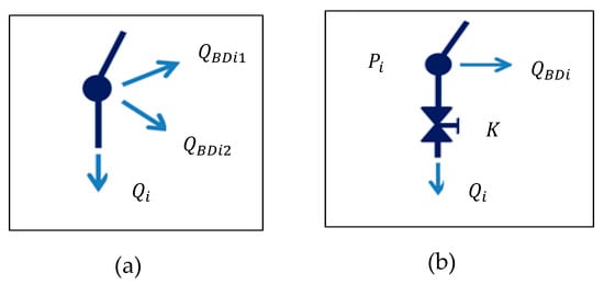 According to [5,6], the best way to represent leaks in a hydraulic network model is not through an additional demand, but rather with adding a leakage valve for each node i, as shown in Figure 1b.
