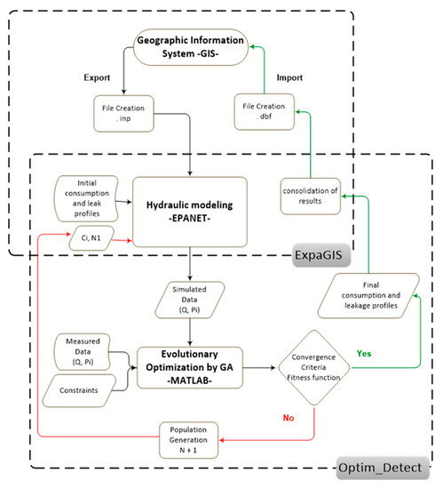 The calibration of the model (flow and pressure) was successfully carried out using the Optim_Detect tool. It was tested and validated by minimizing the fitness function, comparing the pressure and flow rate values measured with the results of the simulation.