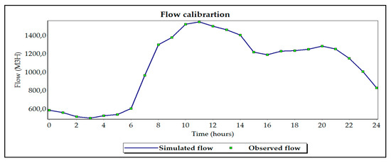 where is the base demand for consumption, it is an average annual consumption of users based on individual meter indices. The customers are geo-located (knowing the x and y coordinates of each customer), their consumption is assigned to the nearest nodes in the hydraulic model by using the SIG/EPANET export tool (ExpaGIS). is the additional consumption of leakage, determined from the minimum night flow QMNF and homogeneously distributed to all nodes assuming that = and the leakage time profile is constant =1 over the duration of the simulation (24 h) following a time step of 1 h. The consumption profile is calculated by subtracting the minimum night flow rate QMNF from the measured hourly total flow rate.