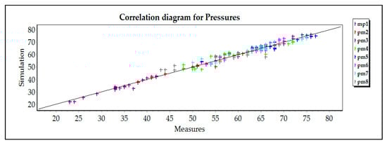 During the calibration process, the coefficients Ci and the emitter exponent N1 were adjusted as calibration parameters of the flow rate and of the 8 points of pressure measurements. The calibration results are presented in Figure 3 and Figure 4.