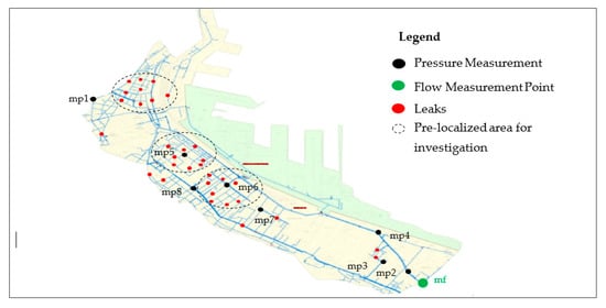 - Determination of the unique emitter coefficient for all nodes of the network by using the FAVAD concept; ; where is Minimum Night Flow and is the average pressure (During MNF) of the k pressure sensors installed in the network