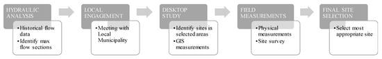 This study entailed the identification of sites with small-scale HK potential in a specific municipality, selected by governmental funding allocation. The site selection was thus limited to sections of the Boegoeberg irrigation canal in the !Kheis Municipality. The focus of the study was on developing a system with a generating capacity of less than 50 kW to aid the local municipality and prove success of such an installation. The site selection procedure followed the guidelines portrayed in Figure 1.
