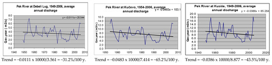 There are three hydrological stations on the Pek River: an upstream station at Debeli Lug (near Majdanpek), a central station at Kučevo, and a downstream station at Kusiće (near V. Gradište). Figure 2 shows their observed annual discharge and trends. The longest existing time series for these stations have been included and a national study indicate that the registered long-term trend for the Pek River is about −40%/100 years. The greatest factor are attributed to CC, after that to LU [4].