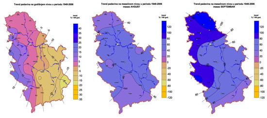App. long-term annual and monthly for August and September precipitation trends (%/100 yrs) in Serbia [3,4,5,6].