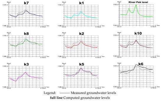 Model calibration results–parallel representation of measured and computed groundwater levels at select piezometers under transient conditions for the March–June 1997 period. Note: The ordinate shows the piezometric head in meters above sea level, and the abscissa shows the simulation time in seconds (in exponential notation).