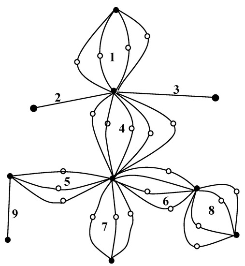 The basic idea is to construct a virtual graph originating from the actual graph of the BWSS and to find paths of minimal length in the virtual graph. Every edge of the virtual graph is assigned a length equal to the cost of the actual pipe that it represents. Since there is generally more than one choice for each actual pipe, the virtual graph will consist of the same junctions as the actual one and of multiple alternative connections between these junctions, as in Figure 2, which depicts the virtual graph corresponding to the actual graph of Figure 1. The numbers on the graph of Figure 2 correspond to the numbers of the individual conduits of Figure 1. The alternative paths between connected nodes are clearly shown. They represent the possible diameters of Table 3.