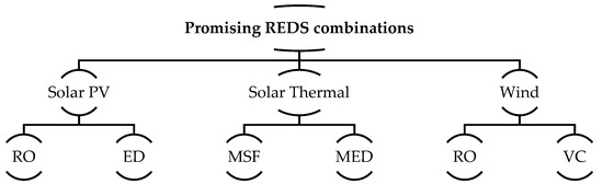 The first step in implementing the methodology is to look at several renewable energy powered desalination systems. In order to limit our search space, we will only consider the most promising and practical combinations of renewable energy subsystem and desalination subsystem as discussed in the introduction. Based on the above literature, the most promising combinations are RO-Wind, RO-PV, and Solar thermal-MED.
