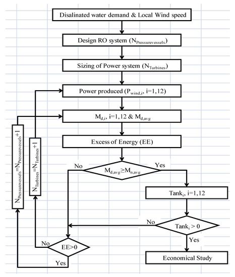 In order to come up with the appropriate design of Wind-RO, the following methodology is applied. The presented methodology uses water storage to ensure water availability instead of energy storage. This selection makes the system more reliable, more economical, feasible especially for large capacity, more environmentally friendly and it is in line with our primary goal of water production. The methodology is as the following: