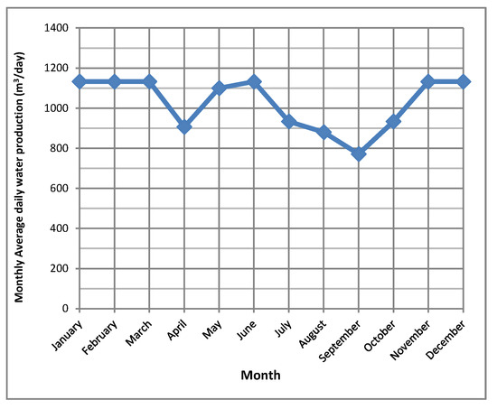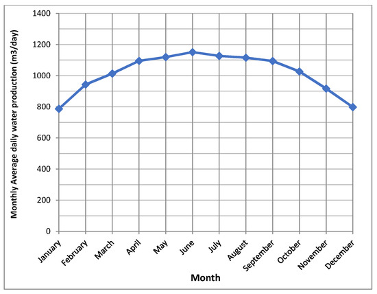To illustrate the application of the methodology, different cases are analyzed and compared for the city of Dhahran, Saudi Arabia. For RO systems, the fixed parameters for which these cases are analyzed are summarized in Table 3 and Table 4 show the results obtained for RO-Wind and RO-PV systems. Figure 5 and Figure 6 show the average water production of each month for RO-Wind and RO-PV systems, respectively.