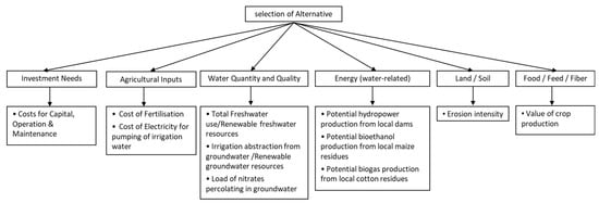 The criteria for the evaluation of the alternatives express important attributes and objectives of the planning. Criteria are represented by relative environmental and socio-economic indicators, which are determined by experts in collaboration with stakeholders. The criteria (and the relative indicators) can be grouped under different points of view in a hierarchical structure to facilitate the DM to express his preferences in two steps. Firstly, on the importance of the various points of view and, secondly, on the importance of the various criteria under each point of view. Criteria and indicators should be tailored to the specific context of the study area and meet the requirements of science and policy. Taking into account the linkages between water, energy, land and food, it is important to evaluate the alternatives related to agricultural water management, from all points of view related to WELF nexus. Thus, the nexus points of view should be made explicit in the overall set of points of view and representative indicators should be selected. Furthermore, criteria modelling is needed to identify physical constraints or regulatory threshold values. In addition, it should be recognized which criteria should be minimized or maximized, and which pairs of criteria create synergies or tradeoffs.