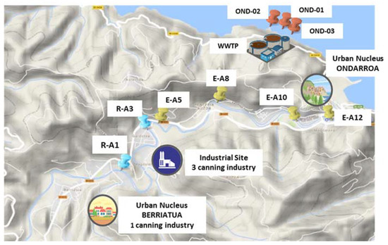 The demonstration test of the project is being carried out in the Biscayan area of Artibai, more specifically, in the sanitation system that connects the towns of Berriatua and Ondarroa with the WWTP of Galtzuaran (Ondarroa). The main discharges connected to this network are from the two mentioned locations and an industrial area (polygon of Gardotza), where three of the four canning companies belonging to the project are located (Conservas Aguirreoa, Heisa and Marmar) and from Conservas Güenaga that is in Berriatua (Figure 1).