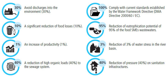 The application of eco-efficient measures in the Food SMEs processes for the wastewater optimization will allow to reduce 30% of the wastewater discharges to the environment, the reduction of food losses, and therefore the reduction of 40% in the high organic load to sewer system, aiming at the small businesses to fulfill the current environmental policy. Moreover, the integration of industrial discharges to the sewer system by means of the RTC and the virtual simulation platform of complete sanitation system will allow a reduction on the pressure over the sanitation structures. Finally, the discharge of effluents properly treated to natural environment will allow the global ecosystem protection and a significative reduction on water stress in the river basin. Figure 3 shows a numerical abstraction of the benefits expected from the execution of this project.
