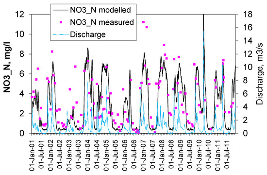 Daily water flow and concentrations of nitrate nitrogen were modelled for 11 years. Five years were used for calibration and six for validation. Efficiency of modelling was estimated by the Nash-Sutcliffe efficiency (NSE) [19] for validation period. The NSE is a normalized statistic that determines the relative magnitude of the residual variance (“noise”) compared to the measured data variance (“information”) [20]. It indicates how well the plot of the observed versus the simulated data fits the 1:1 line. The NSE was computed using the equation: