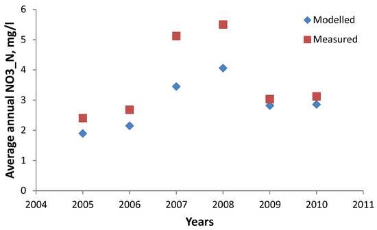 From Figure 3 the increasing trend in average annual concentrations of nitrate in years 2005–2008 can be seen. The NO3_N concentrations decrease rapidly in 2009 and remain the same for 2010. This annual change is linked with the changes in meteorological conditions because other factors e.g., fertilizer usage during the period was practically the same [22]. The annual average runoff increased in 2005–2008 and decreased to a steady level in 2009–2010 resulting similar behavior in NO3_N average annual concentration changes. Therefore, meteorological conditions have to be taken into account while analyzing the trends in nitrate concentrations in the watershed.