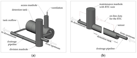 Underground stormwater detention solutions: (a) Off-line detention tank; (b) In-line detention tank with RTC.