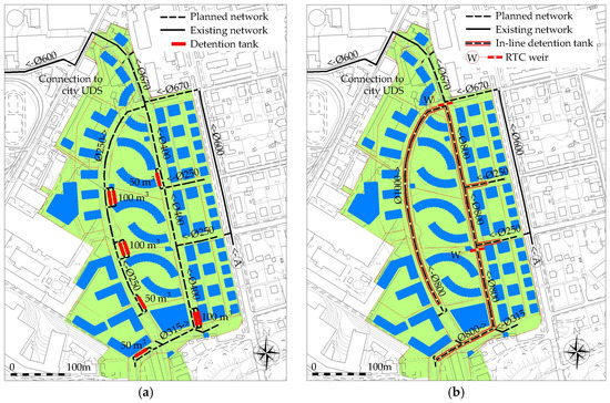 Technical solutions for the peak flow reduction: (a) Off-line detention tanks; (b) In-line detention with RTC.