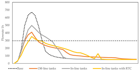 Results of the base scenario and three scenarios for the peak flow reduction are presented in the Figure 4. It can be seen that none of the options fully meet the outflow constraint (300 L/s), therefore some LID facilities had to be chosen on the plots to provide the additional cut. From the hydraulic efficiency the scenario four—in-line detention with RTC—showed the highest results, reducing the peak flow up to 47%. It is important to note that in-line detention without RTC (option two) has on the contrary the lowest effect on the peak flow reduction (26%). Traditional off-line detention gained the result of 39%, which correlates with the numbers presented in other research articles [7,9].
