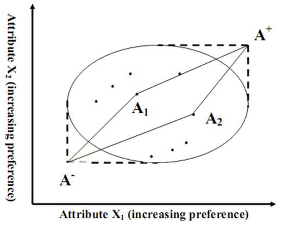 Basic concept of TOPSIS method (A+: Ideal point, A−: Negative—Ideal Point).