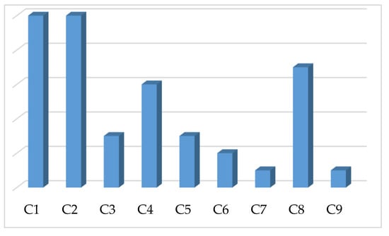Firstly, the decision maker constructs the pair-wise comparison matrix of the criteria (Table 4). Since the consistency ratio (C.R.) is less than 0.1 or close, the judgments are acceptable. Finally, in order to calculate the weights of the criteria, according to Saaty, the eigenvector is calculated (Table 5). In Figure 2 the column chart, whose values derive from Table 5, shows the weights’ comparison across the criteria.