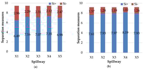 In Figure 3, the charts present the results of calculating the separation measures, Si+ and Si− (Equations (6) and (7)) with each of the two approaches.