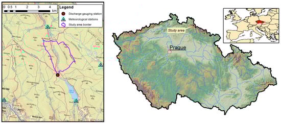 The study area with the location of meteorological and discharge gauging stations (left) and location of the study area in the Czech Republic (right).