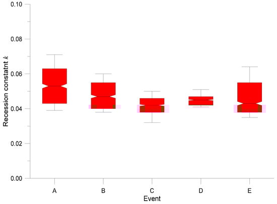 First, the runoff conditions were evaluated for each single event individually by calculating the statistics of k values. The results are presented in the Table 2. For a better overview of the results, the box and whisker plot was drawn based on calculated statistics (see Figure 2). Mean values of recession constant k vary between 0.043 and 0.054 while medians between 0.043 and 0.053. The results indicate that the values of recession constant k are close one to another. The variability was highest for events A and E while it was very low mainly for event D. The similarity of recession constants for different events will be later analyzed by two-tailed t-test. However, these results indicate in general that it could be possible to treat the study catchment as a linear reservoir.