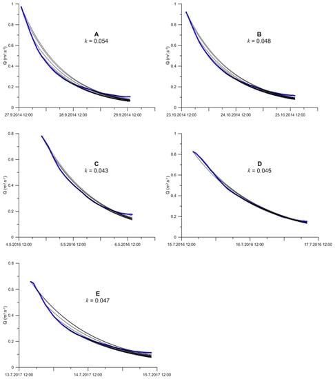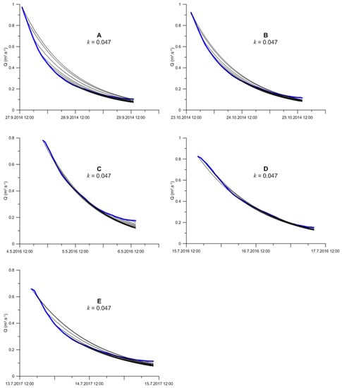 Plot of measured discharges (blue line) and discharges simulated using the value of recession constant averaged for single events for different starting points on the falling limb (black lines). Letters A to E relates to single events (see Table 2).