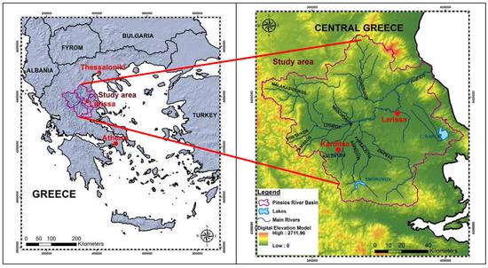 The study area lies between 39°11′ to 39°58′ N and 21°52′ to 22°45′ E (Figure 1), in the Pinios river basin (GR16), the largest catchment in the Thessaly Water District (GR08) with an area of 10,700 km2. The Thessaly plain lies in the center of the catchment and it is mostly a flat terrain which was subsequently filled with alluvial deposits that form the largest and among the most productive agricultural lands in Greece [22].