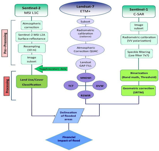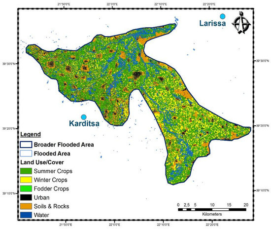 Several data sets were examined to be procured for the purpose of this study. A Level 1T L7 image (path/row: 184/33), was acquired from the USGS Earth Explorer (EE) tool on the 23rd of May, hence the next daytime of the two-day flood event [24]. As well, S1 and S2 datasets were provided via ESA’s Open Access Hub [25]. S1 SAR data was an L1 GRD, high resolution (10 m) Interferometric Wide (IW) image, obtained from C-band during the flood, on the 21st of May (Time 07:05:10 p.m.). Moreover, four S2 images were used, from December 2015 until August 2016, to cover all the crops growth stages for the creation of the land use/cover classification map. The Digital image processing and analysis of the satellite data were carried out using ENVI (v.5.3) and SNAP (v.5.0) software, while the manipulation of the spatial information was made using ArcGIS (v.10.2).