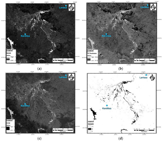 The basic processing step concerned the calculation of the four water indices, the MNDWI, the TCT, the DVW and the RSWIR. MNDWI enhances open water features while suppressing noise from built-up land, vegetation, and soil (Figure 3a). Xu (2006) reported that the MNDWI produced better results than the NDW index, in enhancing and extracting water from a background that is dominated by build-up land areas [12,17]. The TCT is a useful tool for compressing spectral data into a few bands associated with physical scene characteristics [14,15]. The new composite images represent the brightness of each pixel, the degree of greenness/yellowness of vegetation and the wetness which is correlated to soil moisture, water, and other moist features. The other additional components contain image noise and atmospheric influences, such as clouds, haze, sun angle differences etc. The third component that is relating to the tasseled cap wetness (TCW) has been used as a tool for flooded area delineation (Figure 3b). Furthermore, the DVW and RSWIR indices were implemented. The first functions by subtracting the simple Normalized Difference Water Index (NDWI) from the Normalized Difference Vegetation Index (NDVI) [27], while the second uses the Red and Short Wave Infrared (SWIR) bands in its equation (Figure 3c,d).
