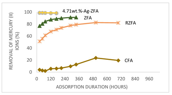 According to the adsorption results Ag NPs containing composite 4.71 wt.%-Ag-ZFA showed 98.73% removal of Hg2+ in just 24 h, which is approximately 10% higher than in K-ZFA. The lowest adsorption value was demonstrated by K-CFA (9.7%) that could be explained by a lower BET surface area demostrated on surface area analysis. It should be noted that K-ZFA, K-R-ZFA and K-CFA reached equilibriums after 14 days, 21 days and 29 days, accordingly (Figure 2), which could be related to both particle sizes and different adsorption mechanisms than in nanocomposites.